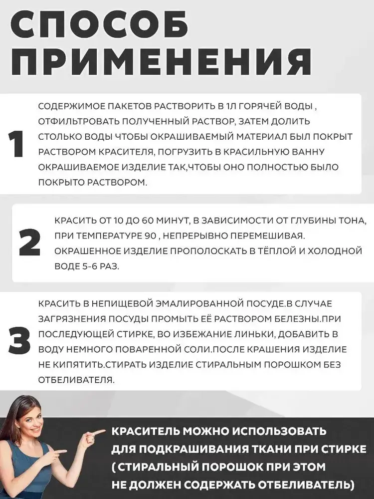 Краситель для окрашивания ткани и одежды, идеально подходит для обновления и покраски джинс и джинсовой одежды. Краска так же предназначена для тканей и одежды их хлопка,льна, вискозы,тенселя,смешанных тканей в состав которых содержание синтетики не должно превышать 50%. Качество окрашивание не уступает фабричному. 1 упаковка краски рассчитана на 1,5 кг.сухой ткани. Сильно выгоревшие, потёртые места одежды могут отличаться по цвету при окрашивании более светлыми,окрашивание придётся повторить для более тёмного и равномерного цвета. Краска не предназначена для 100% синтетики,лавсана,нитрона. Рекомендации: перед применением необходимо ознакомиться с инструкцией на упаковке красителя.